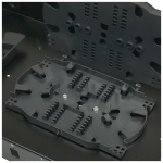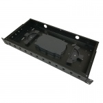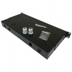 Przełącznica wyposażona w uchwyty rack 19" regulowane w zakresie 115mm. Po demontażu górnej zaślepki (3 śrubki) uzyskujemy dostęp do wnętrza przełącznicy. W zestawie dwie tacki na spawy (łącznie max. 48 spawów), dwie dławice PG do wprowadzania kabla, śrubki do montażu adapterów światłowodowych i opaski zaciskowe.