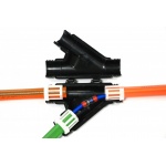 Trójnik przeznaczony do łączenia rur HDPE/RHDPE o średnicy zewnętrznej 40mm z rozgałęzieniem 45°. Złącze jest otwieralne, a nakrętki dociskowe dwudzielne przez co instalacja jest bardzo szybka i nie ma konieczności przecinania lub przeciągania kabli światłowodowych. Rozgałęzienie pod kątem 45° zapewni odpowiedni promień gięcia przewodów, a sam montaż trójnika na rurach odbywa się bez użycia dodatkowych narzędzi. Dodatkowo złącze może służyć jako urządzenie do łączenia mikrorurek prowadzonych w wiązkach (zdj. 6, 7) lub multirurach. Złącze odporne jest na promieniowanie UV oraz niskie i wysokie temperatury, może być stosowane na powierzchni, w gruncie lub w kanalizacji.
